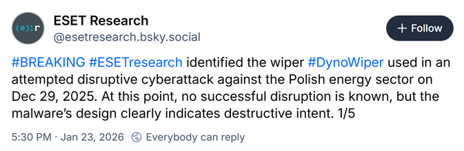 Jak informowały polskie władze, pod koniec ubiegłego roku polski sektor energetyczny stał się celem znaczącego cyberataku. ESET potwierdza próbę zakłócającego ataku, która miała miejsce 29 grudnia 2025 roku. Napastnicy wykorzystali oprogramowanie typu wiper, które analitycy ESET przeanalizowali i nazwali DynoWiper. ESET nie ma informacji, aby w wyniku tego ataku doszło do jakichkolwiek skutecznych zakłóceń.