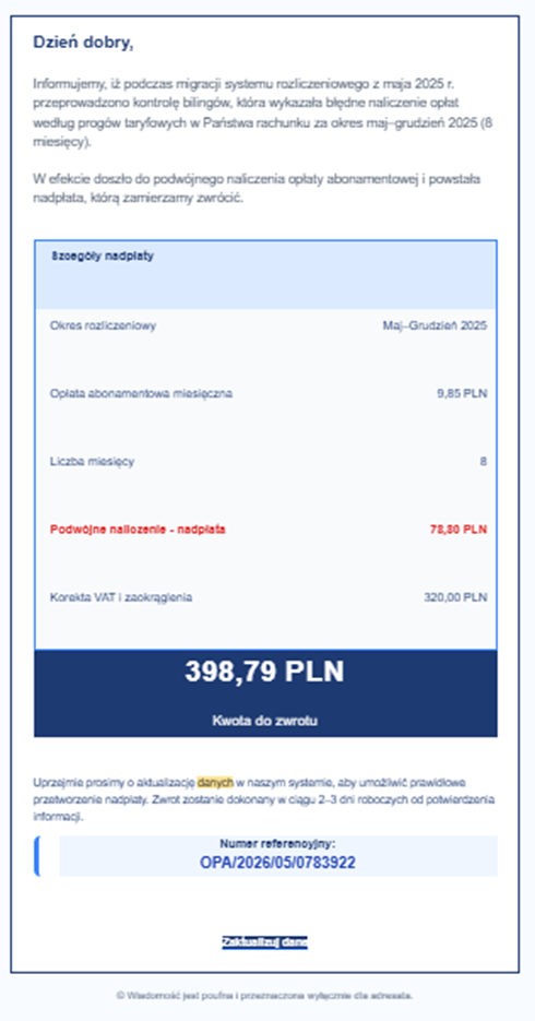 Analitycy ESET informują o trwającej kampanii wymierzonej w klientów polskiej spółki energetycznej. Cyberprzestępcy rozsyłają maile z informacją o nadpłacie, prosząc o uzupełnienie danych, aby uzyskać zwrot. W rzeczywistości to próba wyłudzenia danych karty płatniczej i kradzieży pieniędzy.