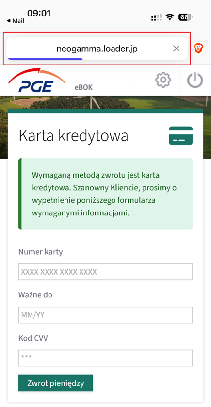 Po kliknięciu w przycisk „Zaktualizuj dane” przechodzimy do kolejnych kroków oszustwa. Pierwszy z nich to wyłudzenie naszych danych logowania do panelu PGE. Aby nie dać się oszukać, należy tu zwrócić uwagę na adres URL strony. Po pozornym zalogowaniu się do serwisu otrzymujemy informację o wysokości nieistniejącej nadpłaty i kiedy klikniemy w przycisk „Zleć zwrot nadpłaty” przechodzimy do najważniejszego momentu, czyli prośby o dane naszej karty płatniczej: